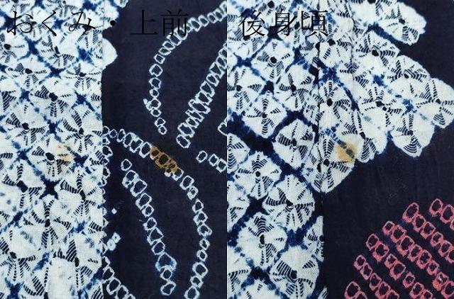 状態は接写画像のように、おくみ・上前・後身頃にシミがございますが、