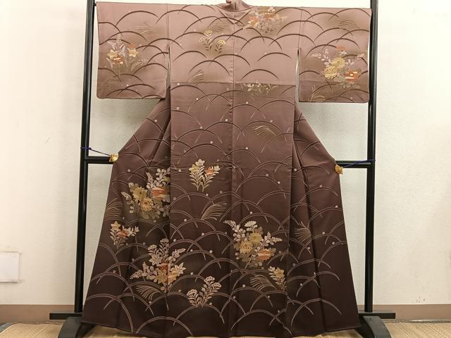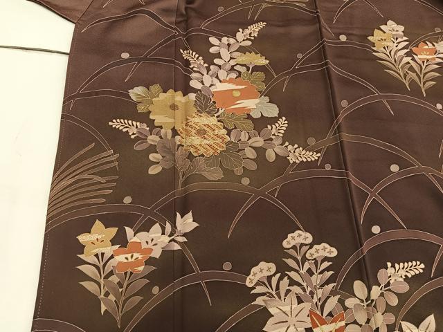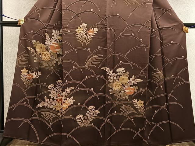 Heiwa-ya Kimono ■ Visiting Kimono, Dew-grass Grass Leaf Pattern, Grass Dye, Gold Accents, Pure Silk, Excellent Item, BAAW1812mz