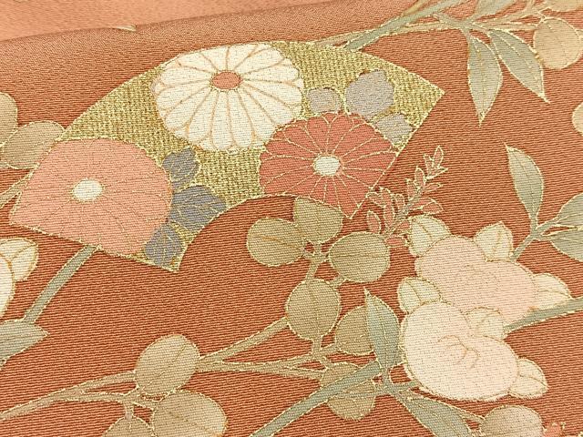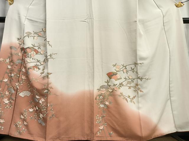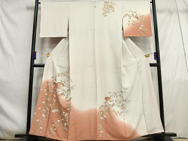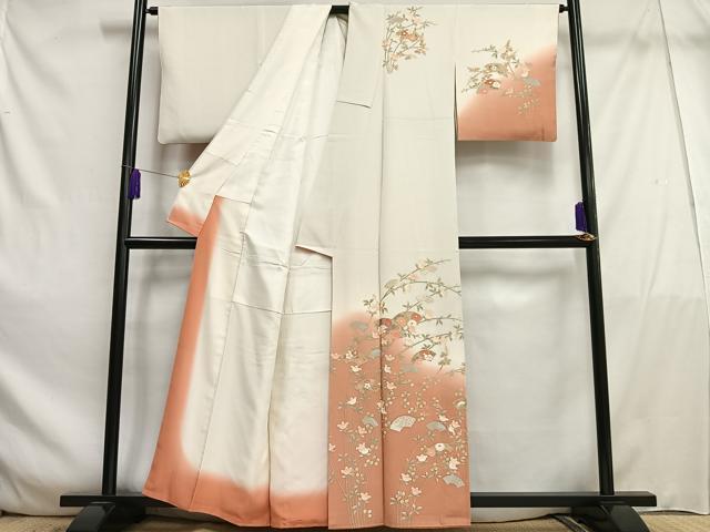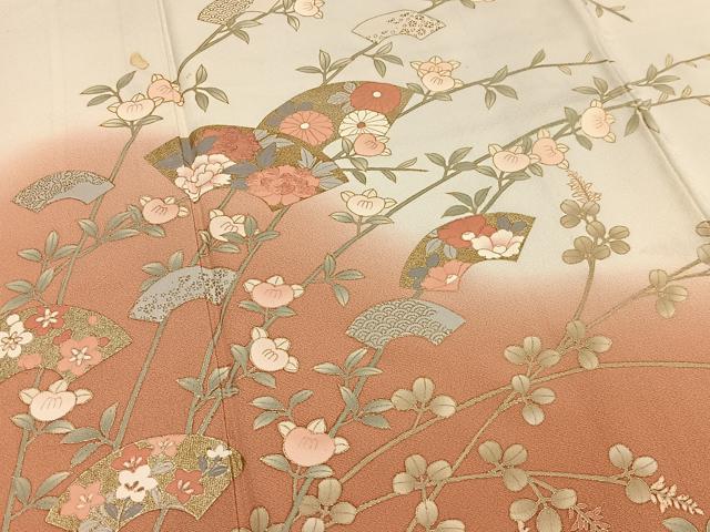 Heiwa-ya Kimono ■ Visiting Kimono, Ground Paper with Floral and Grass Pattern, Gradient Dye, Gold Accents, Pure Silk, Excellent Quality, AABE5075oa