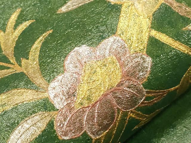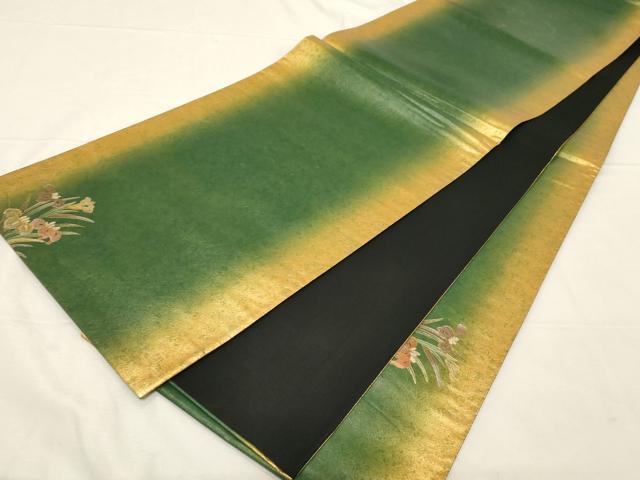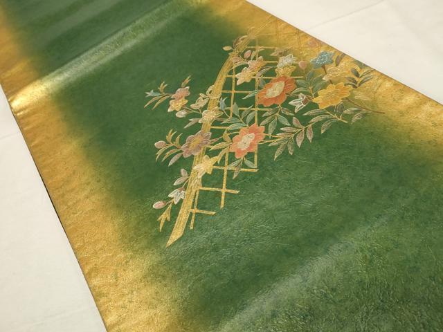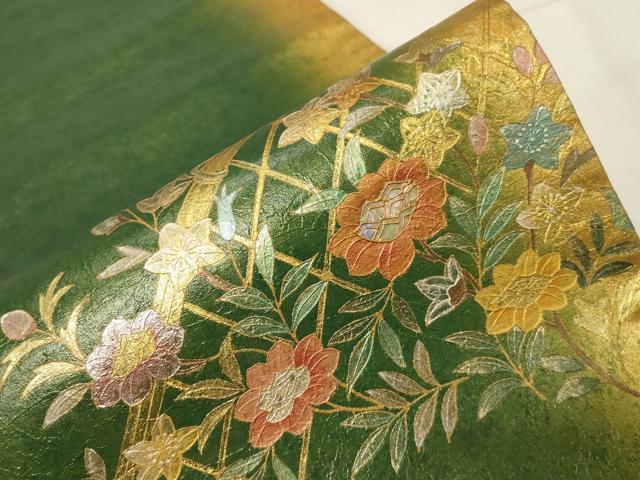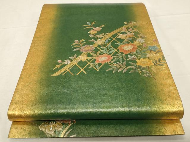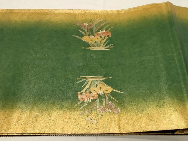 Heiwa-ya Kimono ▼ Nishijin Drum Pattern Obi with Hedge and Flower Design, Gold and Mother-of-Pearl Inlay, Pure Silk, Excellent Quality, CABA9057dy