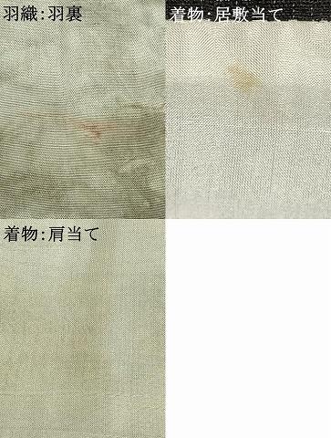 着物の状態は接写画像のように居敷当て・肩当てに薄い汚れがございますが