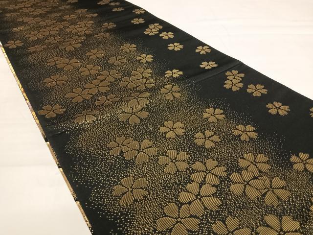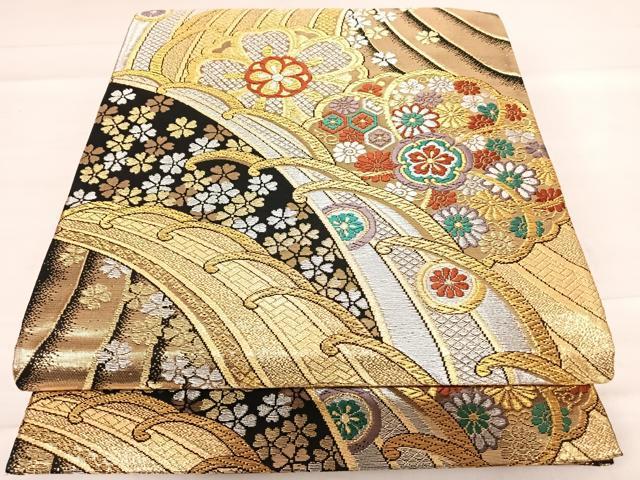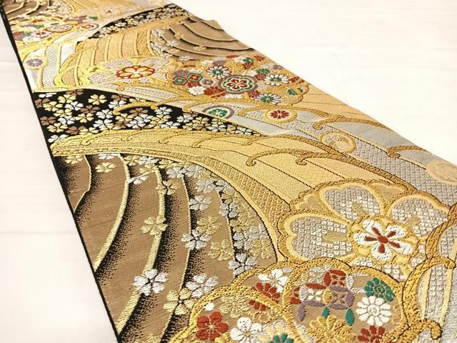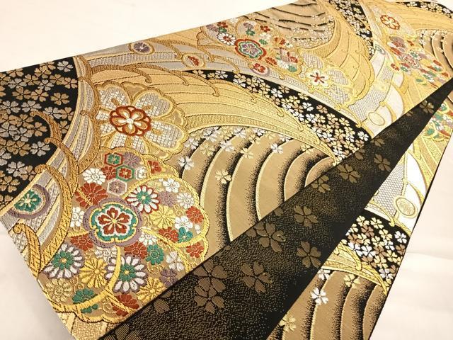 Heiwa-ya Kimono ◎ Double-sided, all-over patterned obi (sash), Karaori weave, standing wave and dancing flower pattern, black background, gold and silver thread, pure silk, exquisite item, AABD7291yx