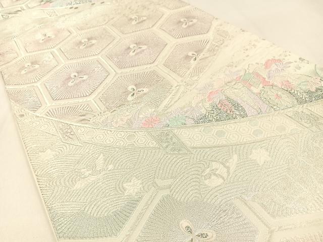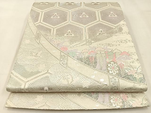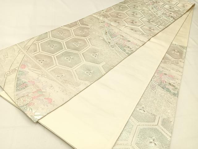 Heiwa-ya Kimono ◎ Six-way Pattern Obi (Sash) - Karaori (Chinese-style) - Imperial Carriage, Tortoise Shell, Flower and Bird Design - Silver Thread - Pure Silk - Excellent Item BAAW0427hj