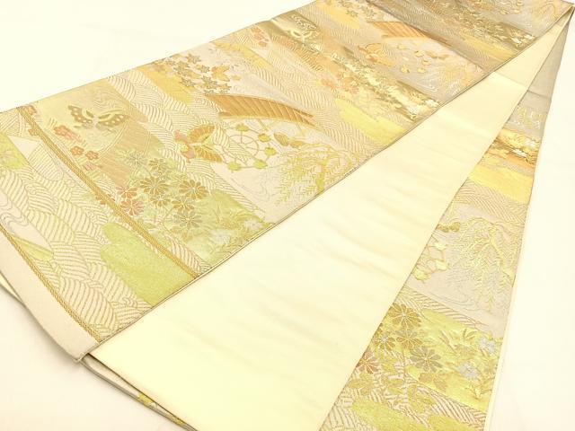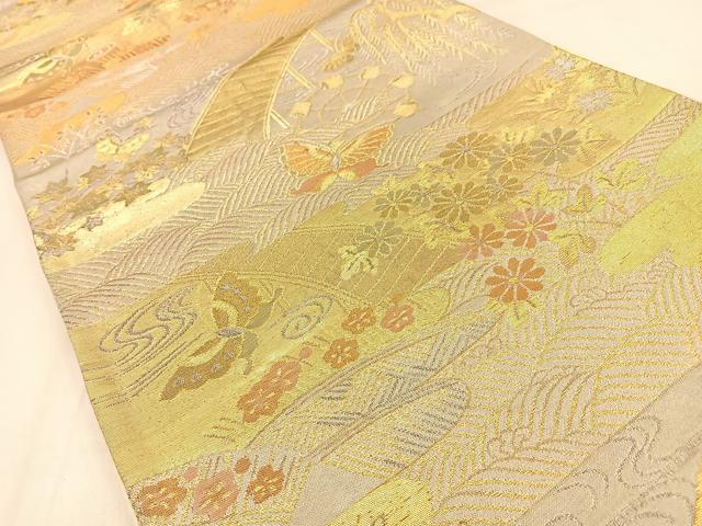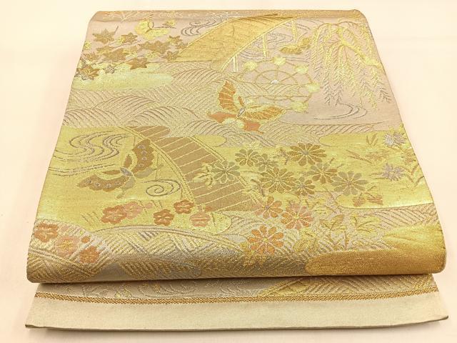 Heiwa-ya Kimono ◎ Six-way Pattern Obi with Crossing Bridge and Flower and Butterfly Design, Gold and Silver Thread, Pure Silk, Excellent Item, BAAW0576hj