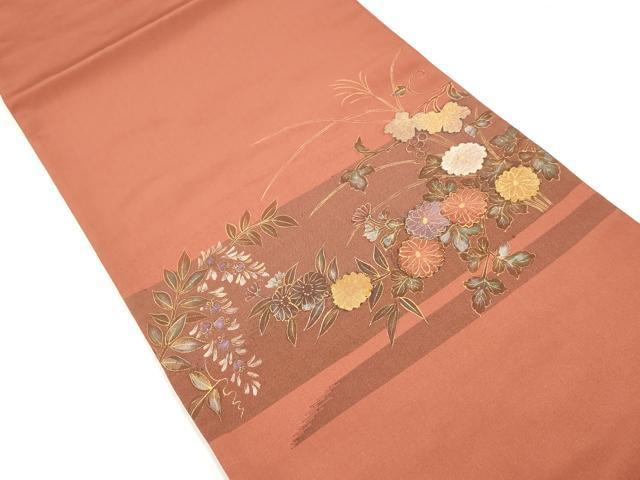 Heiwa-ya Kimono ◎ Taiko Pattern Fukuro Obi (Sash) with a Scoop Weave, Horizontal Stripes, Floral Design, Gold and Silver Accents, Pure Silk, Excellent Item, DABA3142qa