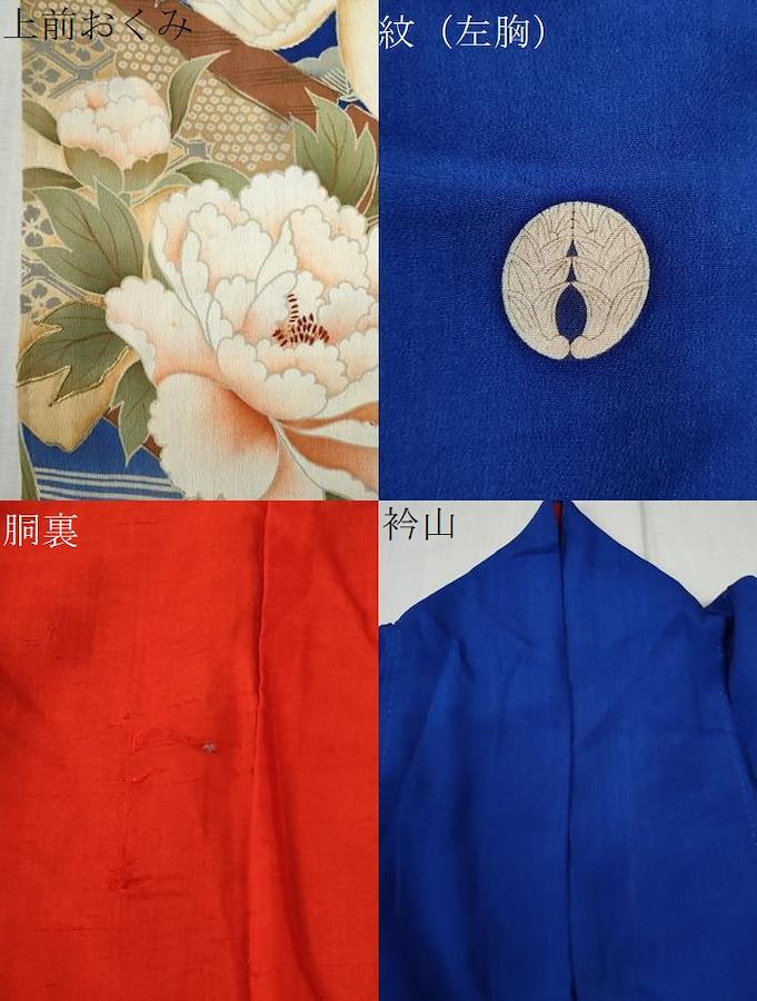 状態は接写画像のように上前おくみ・紋(左胸)・衿山に薄い汚れ、胴裏にほつれがございます。
