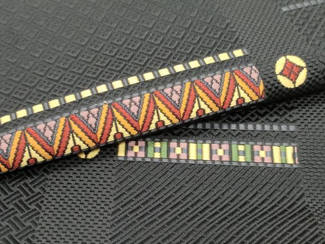 仏具のひとつである独鈷、華皿を基にした幾何学模様が織られています。