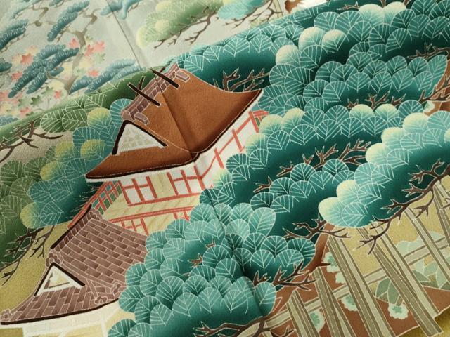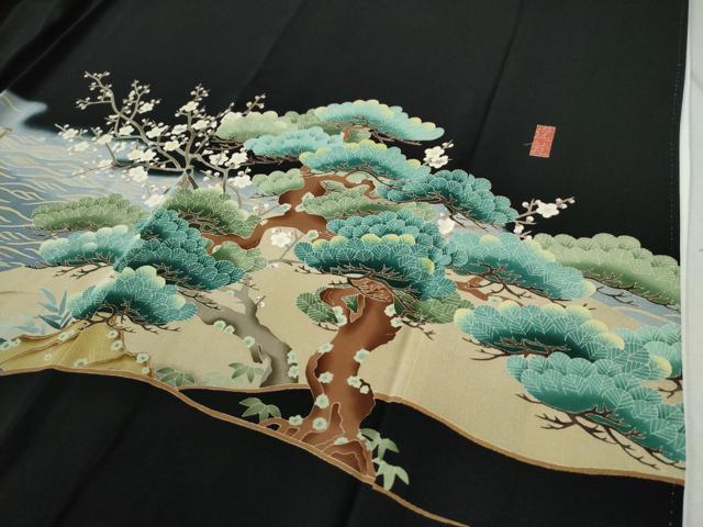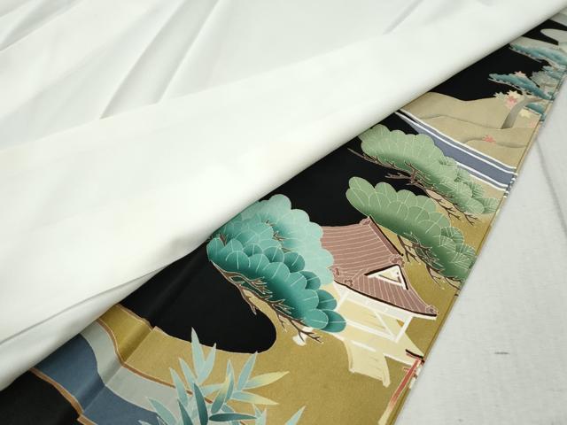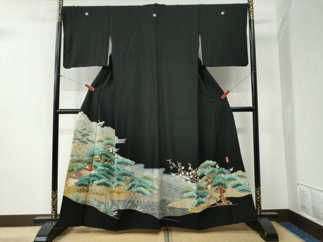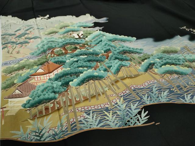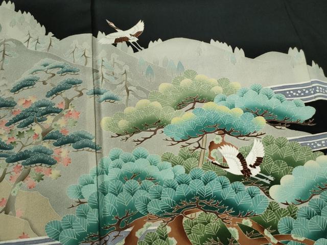 Heiwa-ya Kimono: Authentic Kaga Yuzen kimono by Okuhara Kazunari. Black formal kimono with a design of a landscape of Toyama, Hamamatsu, flying cranes, and forests. Gradient dyeing. Pure silk. Excellent quality. CABB4285yc