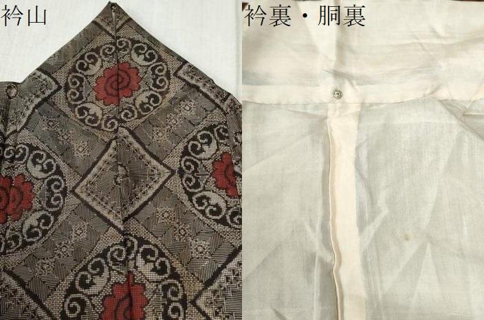 状態は接写画像のように衿山に汚れ、衿裏・胴裏に薄い汚れがございますが