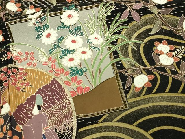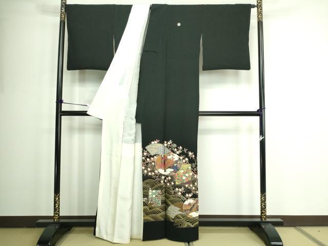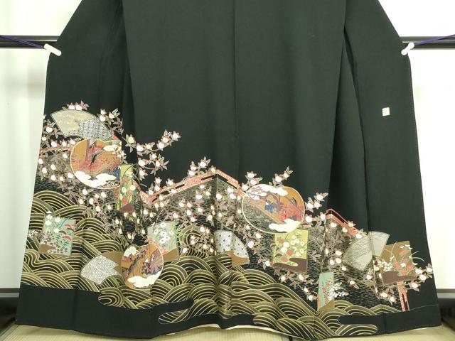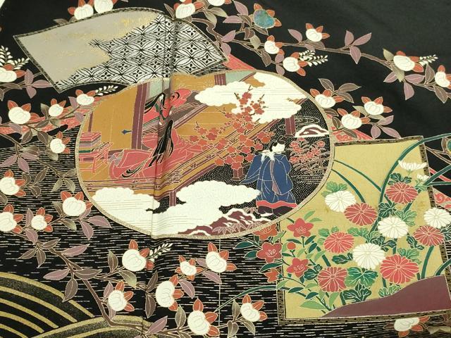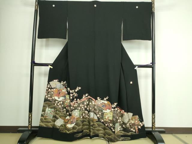 Heiwa-ya Kimono - Dyed Ikkiho Black Tomesode with Portrait and Landscape Design, Gold and Silver Accents, Pure Silk, Excellent Item, DAAZ9747sf