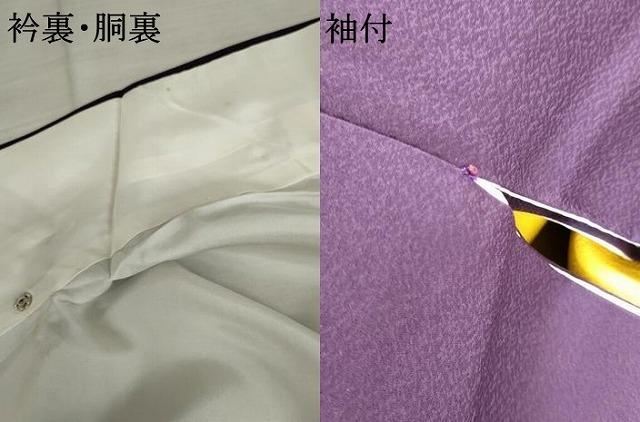 状態は接写画像のように衿裏・胴裏に薄い汚れ、袖付に糸解けがございますが