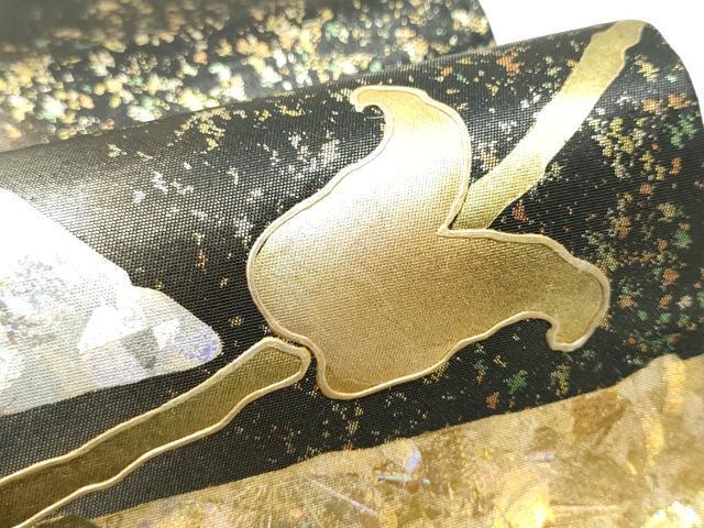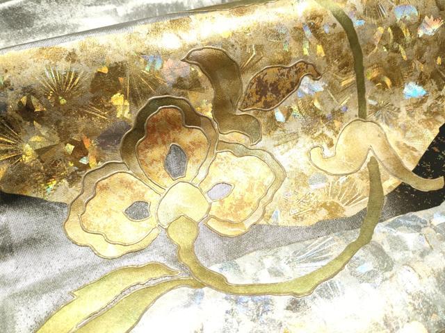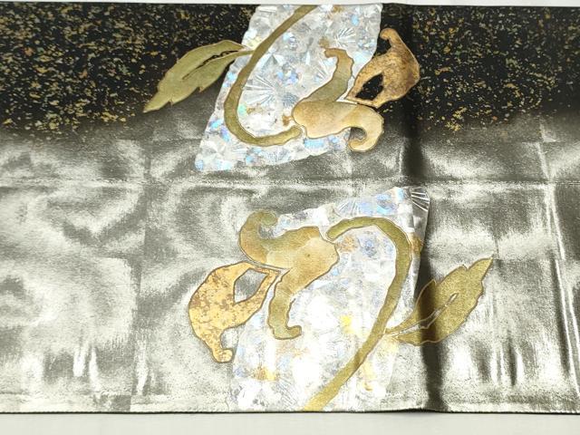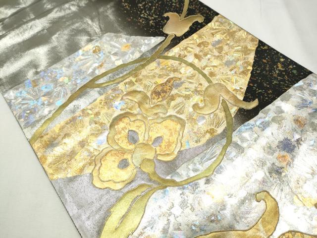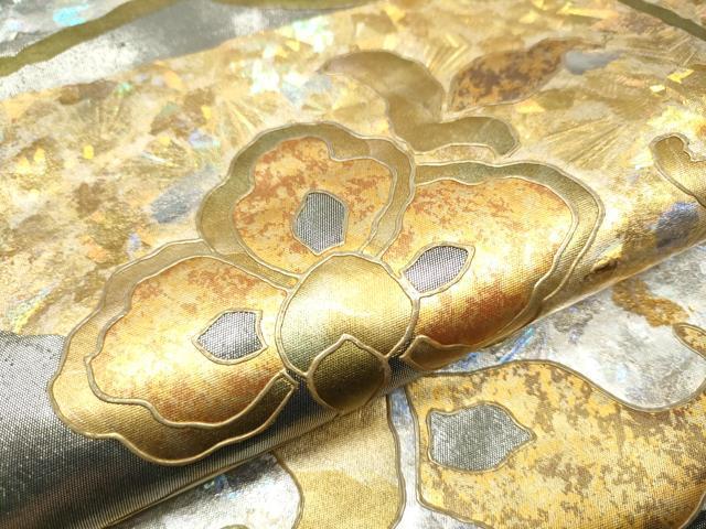Heiwa-ya Kimono: Gold Yuzen Artist and Gold Magician Shohei Hori's Gold-Glittering Obi with a Drum Pattern, Floral Arabesque Design, Gold and Silver Inlays, and Dried Leaf, Pure Silk, Excellent Item, CABB5765hy