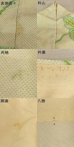 状態は接写画像のように表地所々・衿山・両袖・衿裏・胴裏・八掛に薄い汚れがございます。