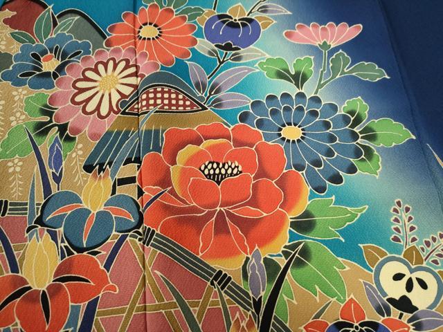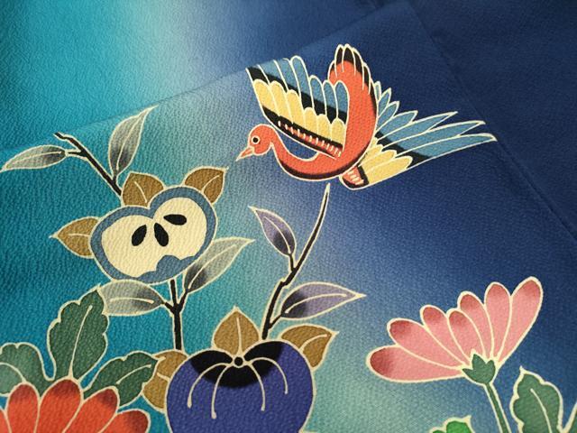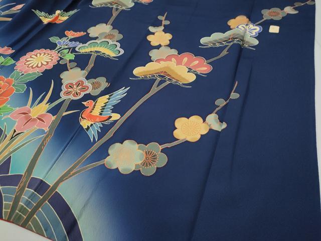 Heiwa-ya Kimono: Hand-sewn Kyoto Bingata dyeing by Miyazaki Ryoji. Long-sleeved kimono with a design of flying cranes, flowing water, pine, bamboo, and plum blossoms. Gradient dyeing. Pure silk. Excellent quality. CABB4201yc