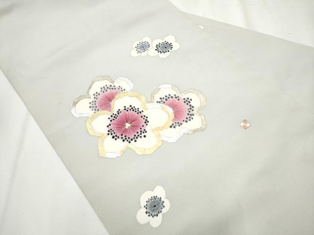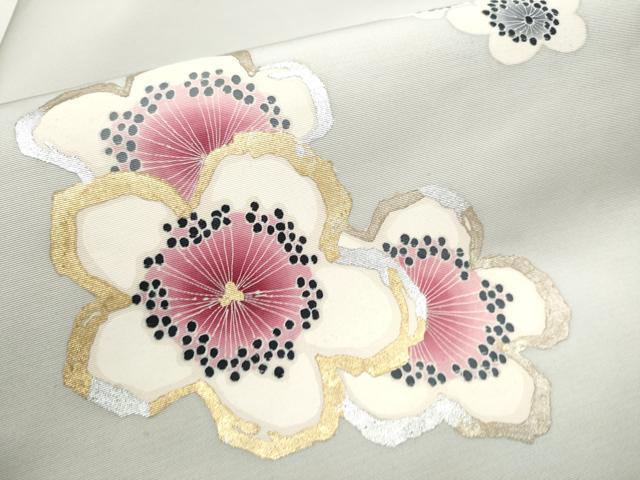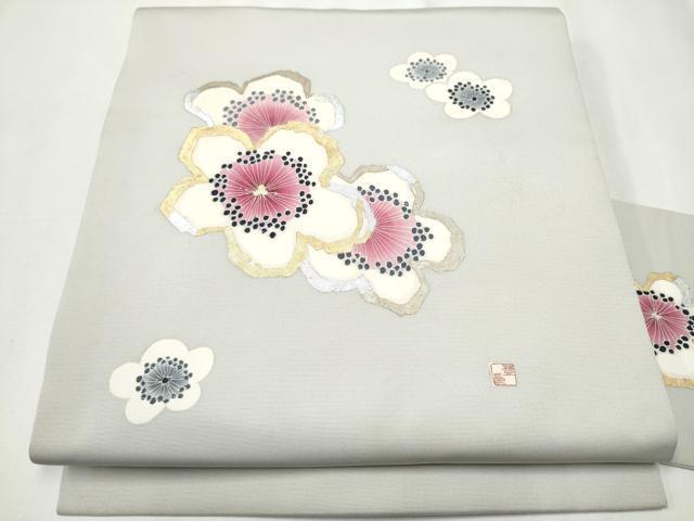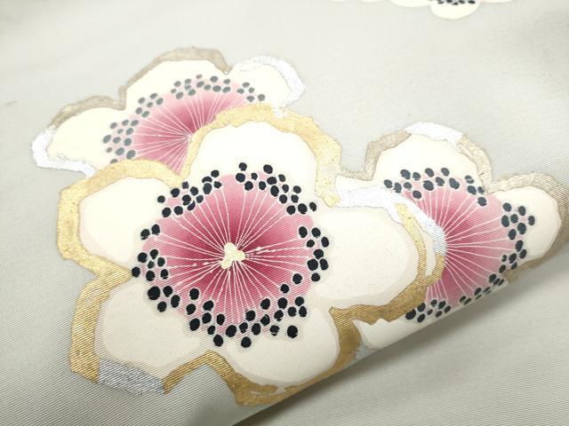 Heiwa-ya Kimono: Kyo-Yuzen Kimono by Haneda Studio, a Kyoto Prefecture designated intangible cultural asset holder. This nine-inch Nagoya obi features a dancing plum blossom design in gold and silver, made of pure silk. CABA0881hy