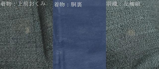 着物の状態は接写画像のように上前おくみ・胴裏に薄い汚れがございますが