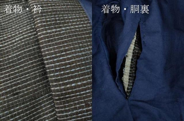 着物の状態は接写画像のように胴裏に糸解け、衿に薄い汚れがございますが