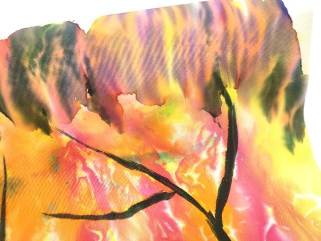 虹染とは初代本郷大田子が考案した染色技法で、優しい色合いの絶妙なグラデーションが特長、いくつもの色を生地ににじませることで色が重なり、虹のような玉虫色を生みだす技法です。