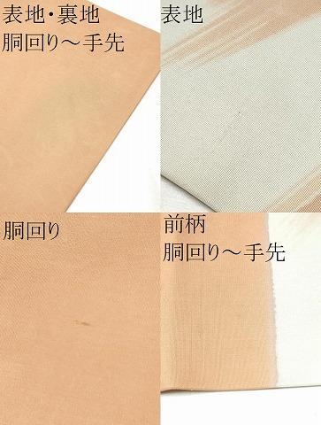 状態は接写画像のように表地所々・裏地・前柄・胴回り〜手先にスレ・汚れがございます。