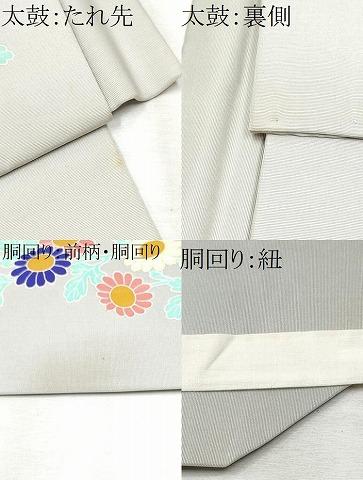 状態は接写画像のように太鼓:太鼓・たれ先に薄い汚れ、胴裏:前柄・胴回り・紐部分に薄い汚れがございますが