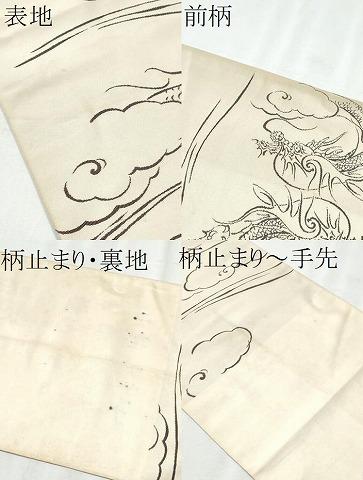 状態は接写画像のよう表地所々・柄止まり・裏地に汚れ、前柄にヤケ・柄止まり〜手先に折れ山の汚れがございます。