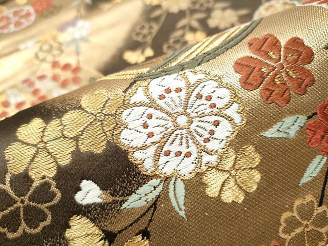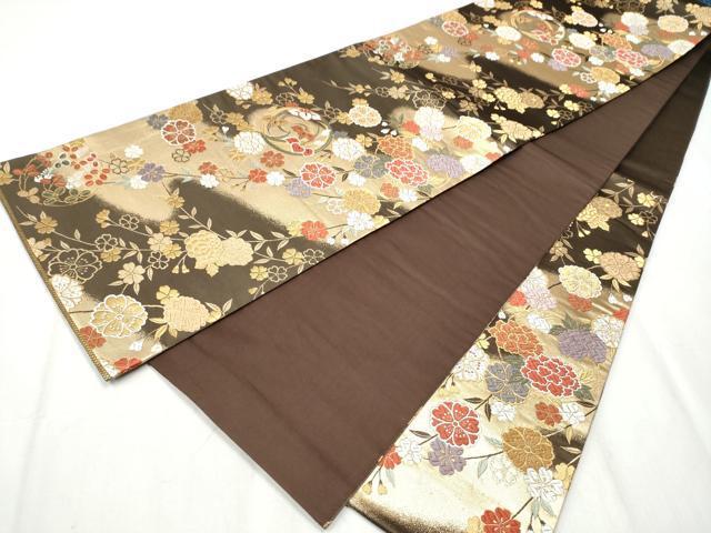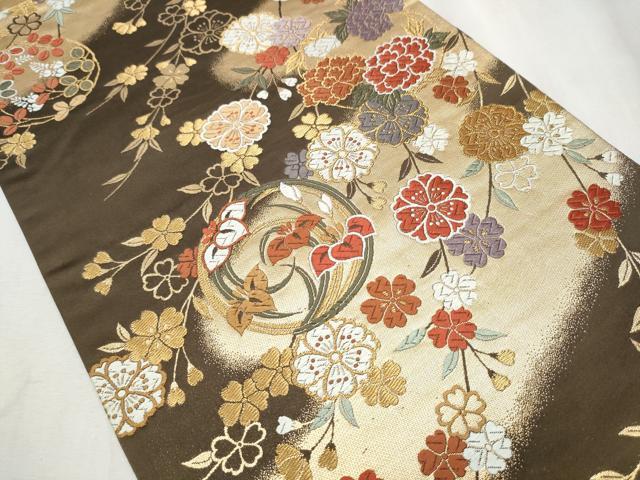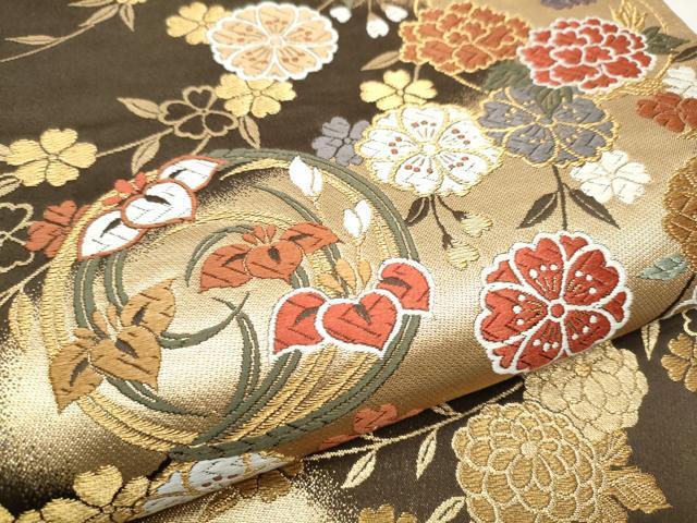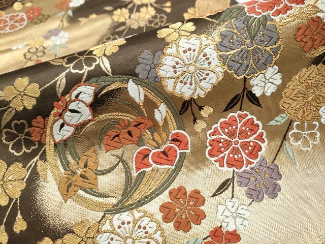 Heiwa-ya Kimono: Six-Piece Pattern Obi (Sash), Karaori Weave, Flower and Plant Circle Design, Gold Thread, Pure Silk, Excellent Quality, CABB5601hy