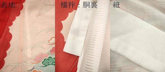 産着【祝着:正絹・襦袢:化繊】の状態は接写画像のように表地所々・襦袢の胴裏・紐に薄い汚れがございます。