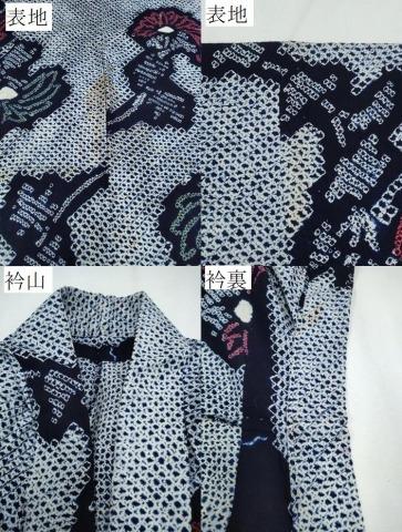 状態は接写画像のように表地所々にシミ・ヤケ、衿山・衿裏に薄い汚れがございます。