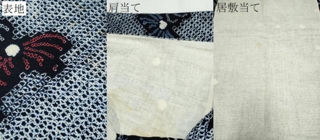 状態は接写画像のように表地所々に汚れ・ヤケ、肩当て・居敷当てに薄いシミがございます。
