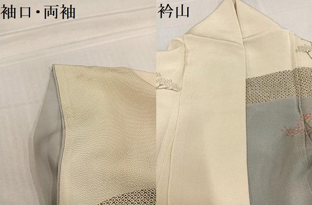状態は接写画像のように両袖・袖口に汚れ、衿山に薄い汚れがございますが