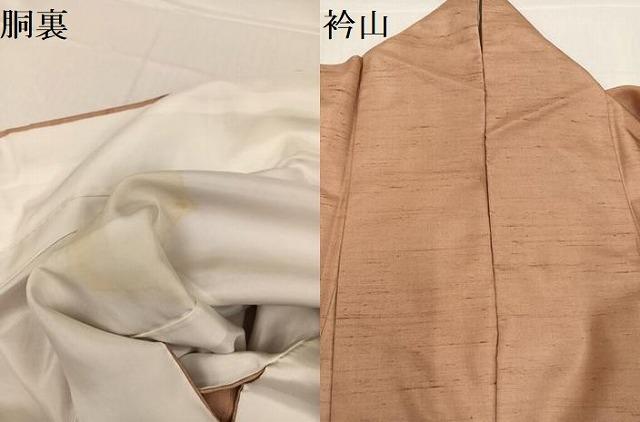 状態は接写画像のように胴裏にシミ、衿山に薄い汚れがございますが