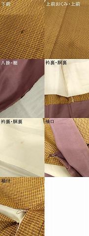 状態は接写画像のように下前・胴裏・衿裏・袖口に汚れ、上前おくみに薄い汚れ、八掛裾に破れ、胴裏・袖口・袖付に糸解けがございます。