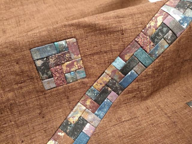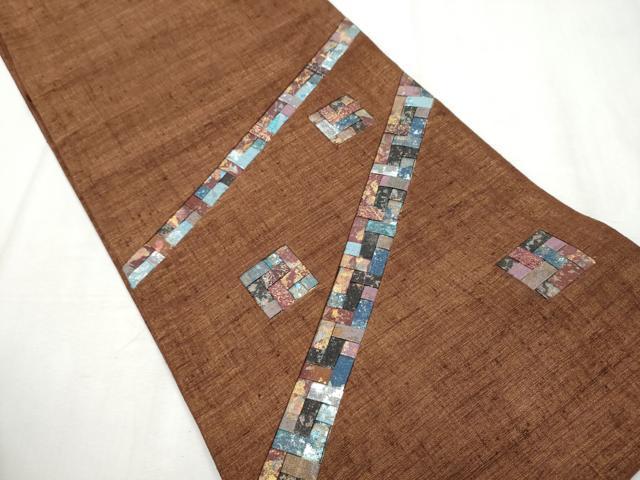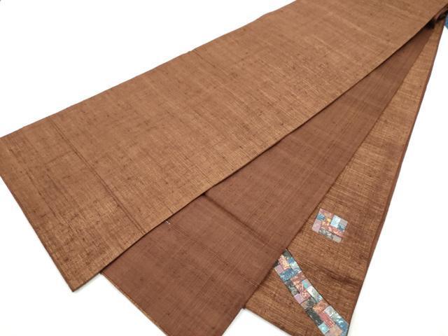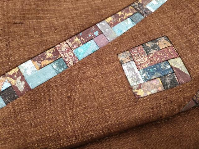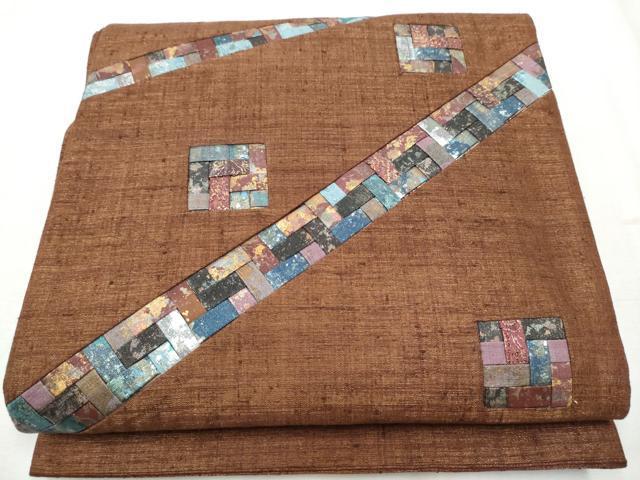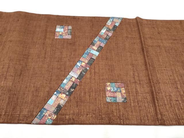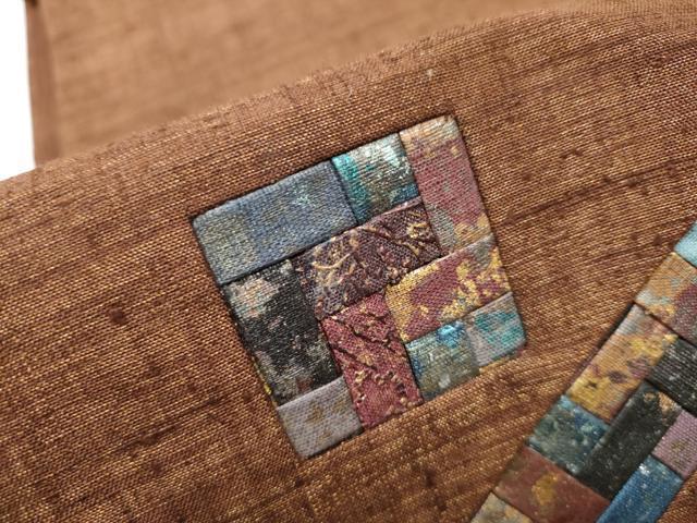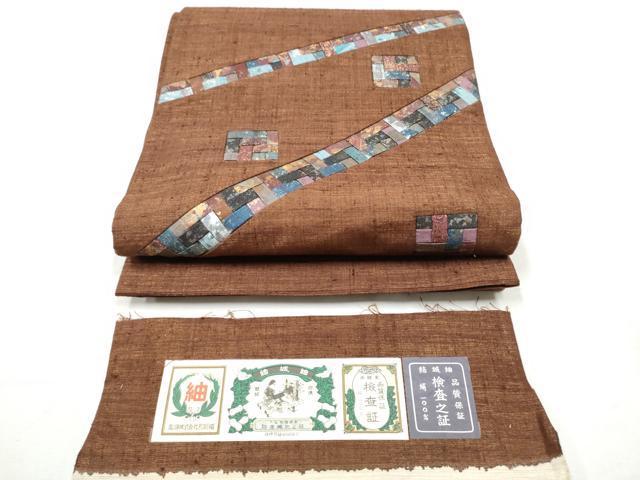 Heiwa-ya Kimono: Yuki Tsumugi Pongee, Taiko Pattern Obi, Geometric Pattern, Gold Accents, Authentic Silk, Excellent Quality, CABB9213hy