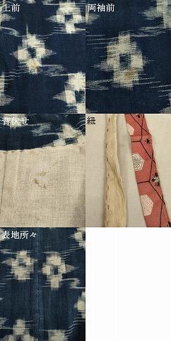 着物【綿】の状態は接写画像のように上前・両袖前・背伏せ・紐部分に汚れ、表地所々にヤケがございます。