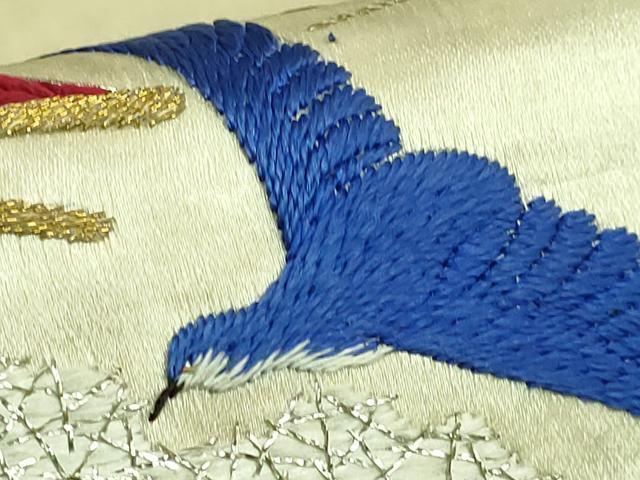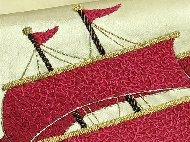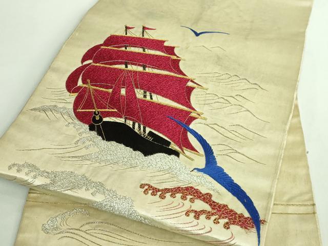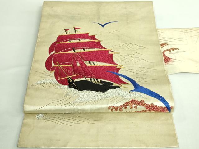 Heiwaya Honten: Exquisite Antique Taisho Romantic 9-inch Nagoya Obi, Fully Hand-Embroidered with Seagulls and Ships, Gold and Silver Thread, Excellent Item, DZAB2874kh6