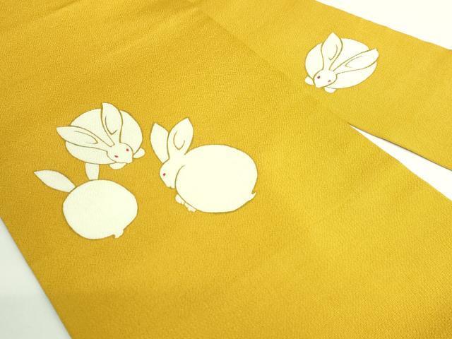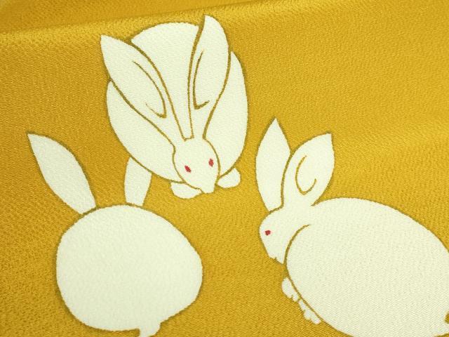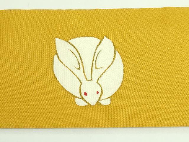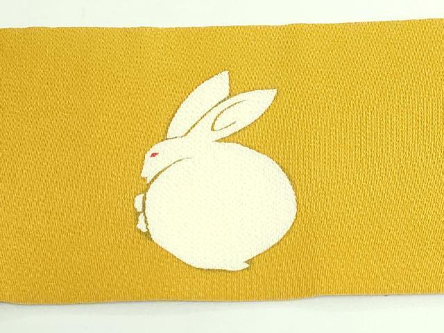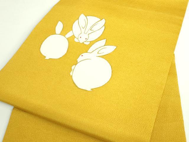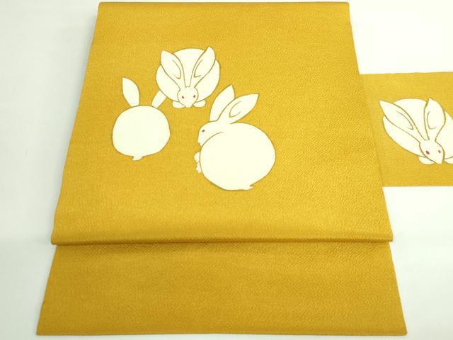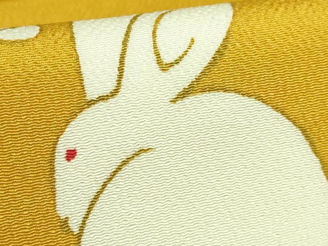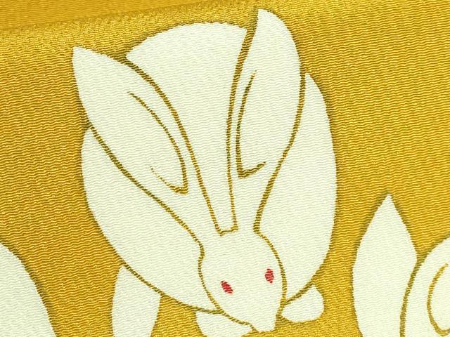 Heiwaya Honten: Exquisite Japanese-dyed Bingata (Kuriyama Bingata) by Kichisaburo Kuriyama. 9-inch Nagoya Obi (Sash), Rabbit Design, Gold Background, Oni Shibori Crepe. Excellent Quality. DZAB3180kh6