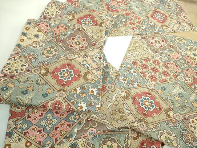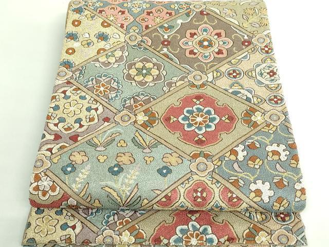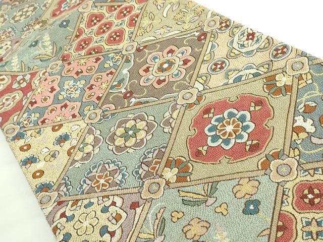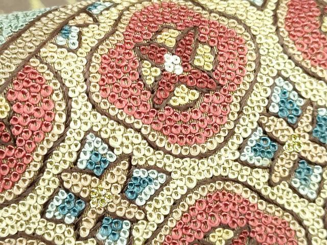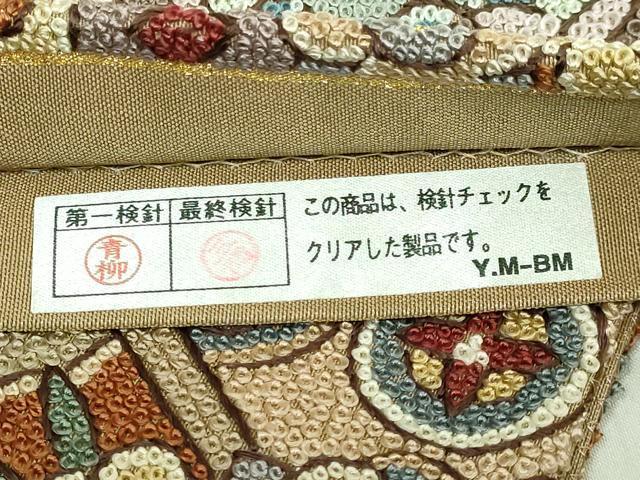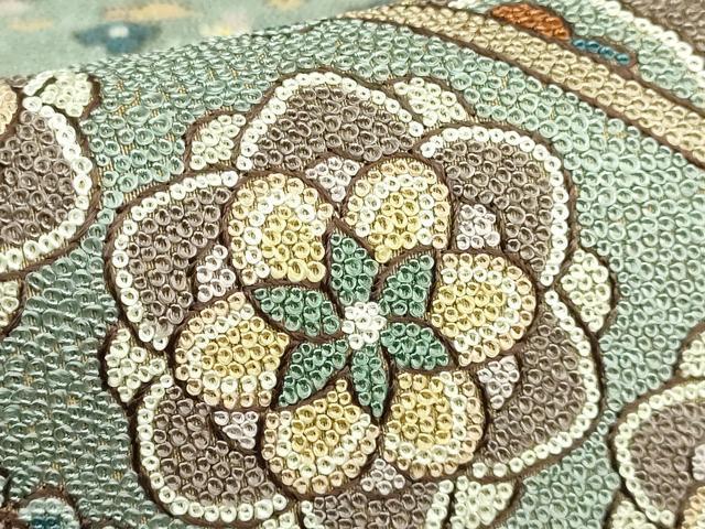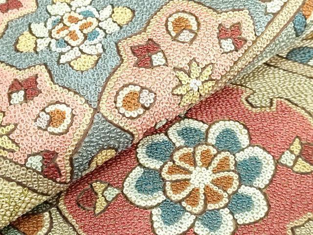 Heiwaya Honten: Exquisite Sagara Embroidery, one of China's three great embroidery styles, featuring 2 million beads of embroidery. This obi features a coffered ceiling floral design and gold thread. DZAB3140kh6