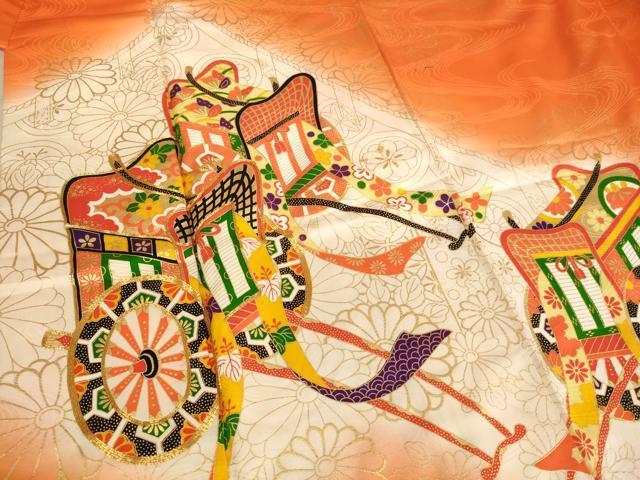 着物【正絹】の状態は接写画像のように後身頃に箔剥がれ、衿・両袖・胴裏に汚れがございますが