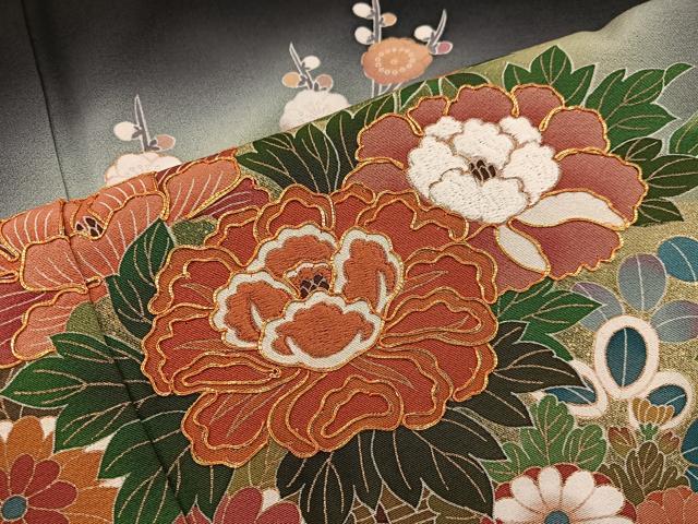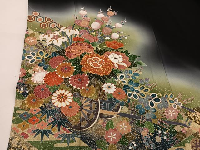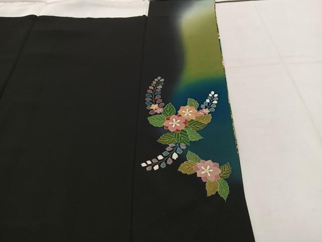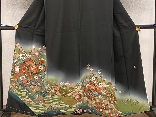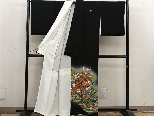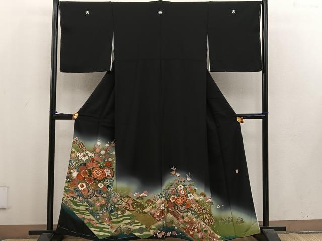 Heiwaya Kimono ■ Gorgeous black formal kimono, artist-made, with embroidery, a float design, and gradation dyeing. Gold accents. Pure silk. BAAV1023mz