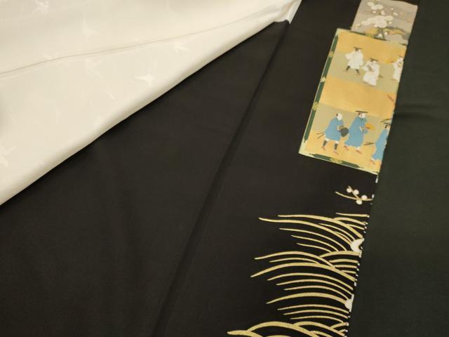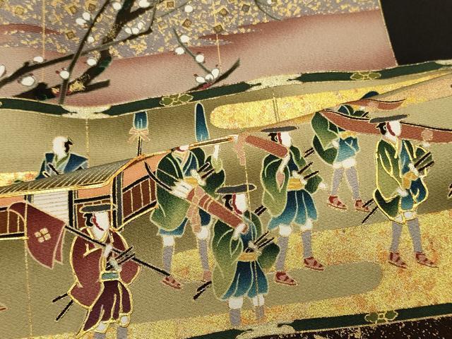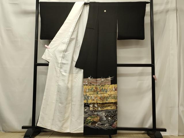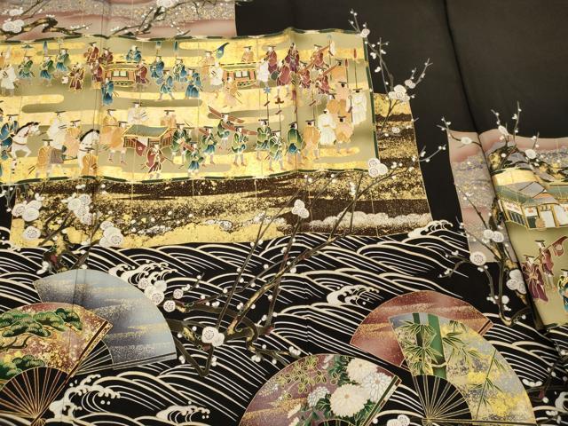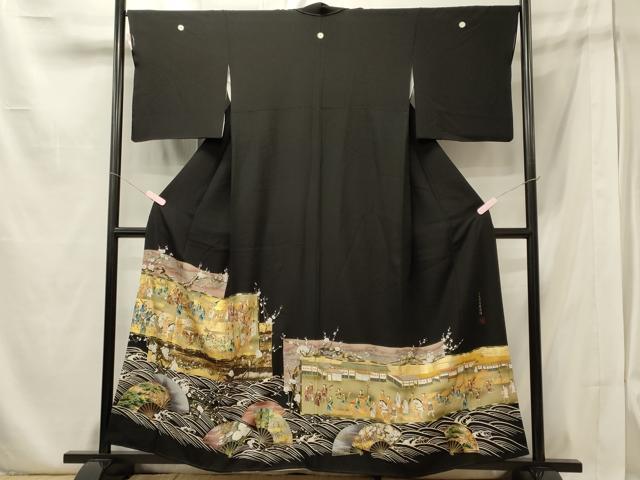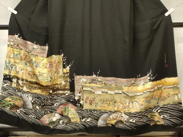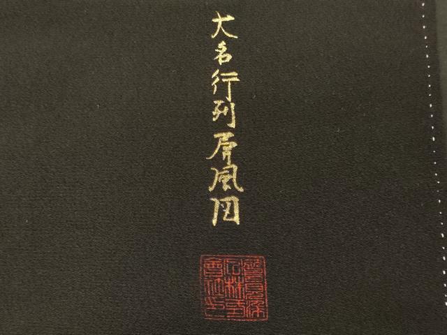Heiwaya Kimono ■ Gorgeous black formal kimono with artist-made embroidery and a folding screen depicting a feudal lord procession, gold-leaf, pure silk, exquisite item, CABB3254oy