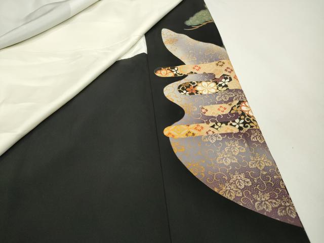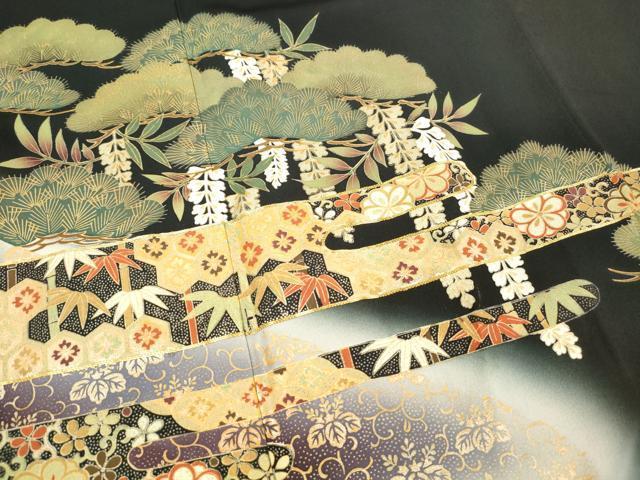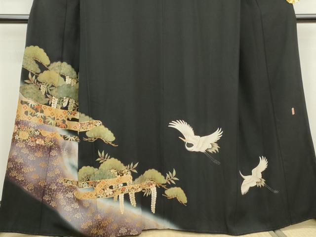 Heiwaya Kimono ■ Gorgeous black formal kimono with artist-made embroidery featuring a hazy, flying crane, branch, and pine pattern, Manju dyeing, gradation dyeing, and gold accents. Pure silk. DABA3286qa