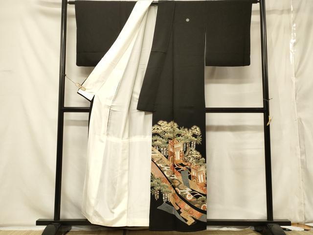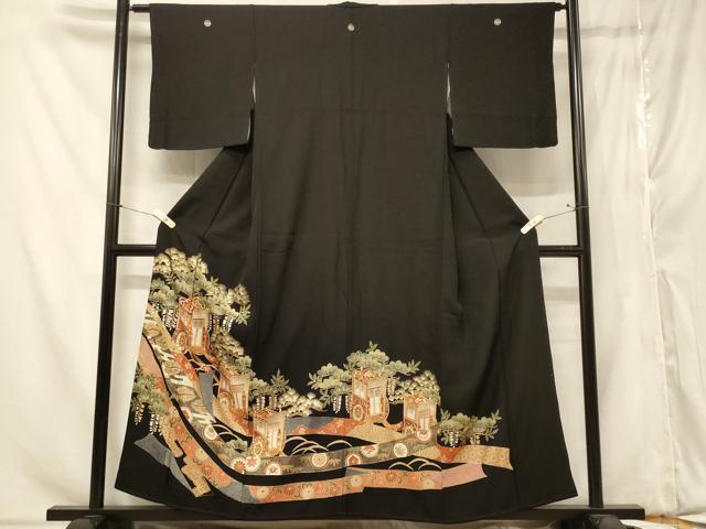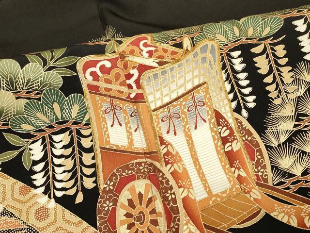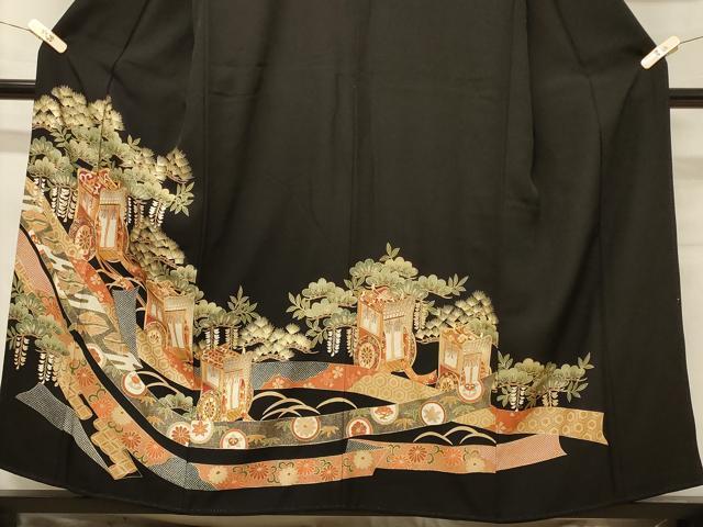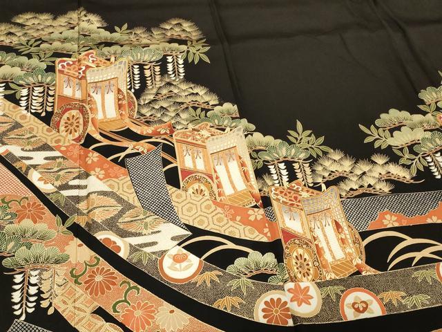 Heiwaya Kimono ■ Gorgeous black formal kimono with embroidery and a floral motif of a traditional Imperial carriage, gold accents, and a silk kimono. CAAZ7992in