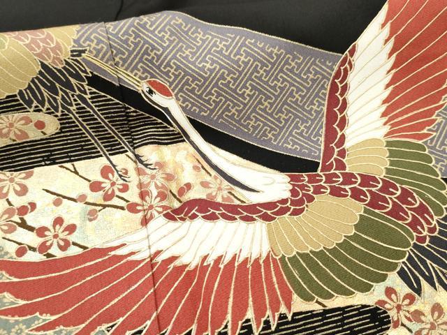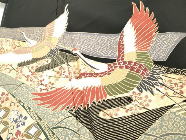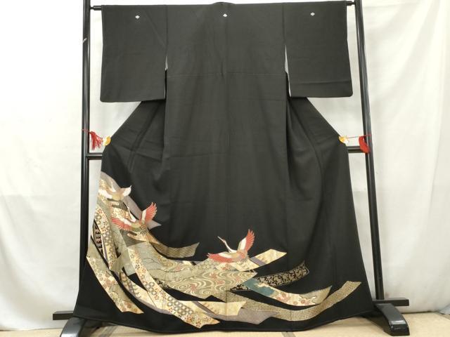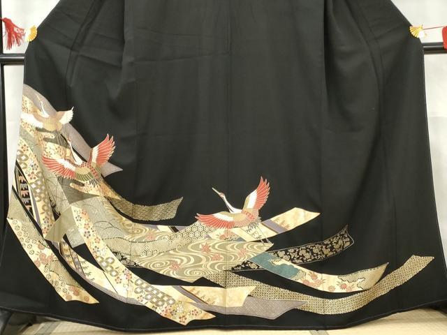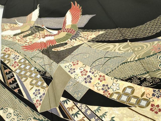 Heiwaya Kimono ■ Gorgeous Black Tomesode with Flying Cranes and Auspicious Flower Arabesque Design, Gold and Silver Accents, Pure Silk, Excellent Item, AABD2483cs