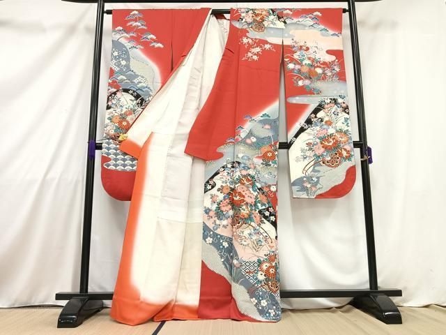 Heiwaya Kimono ■ Gorgeous Furisode Kimono with Floating Carriage Design, Gold Accents, Pure Silk, Excellent Item AABB1784mf