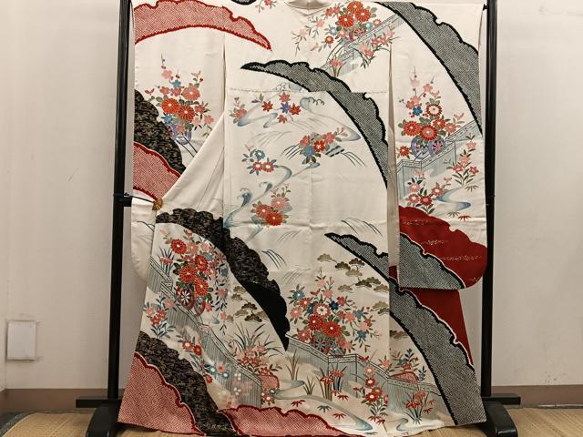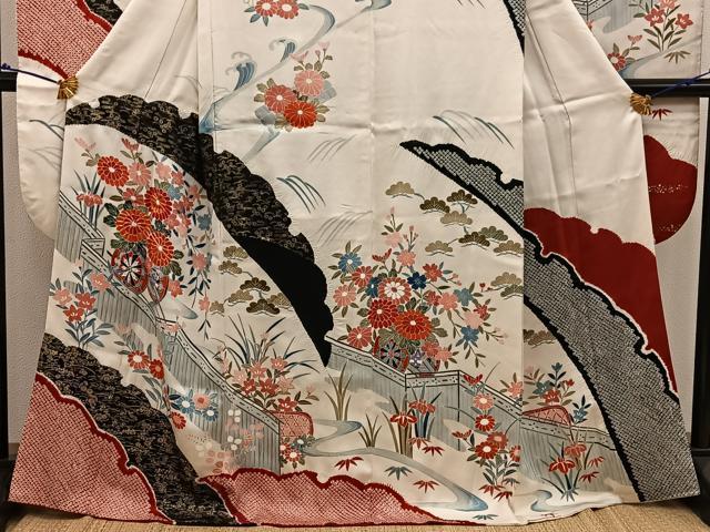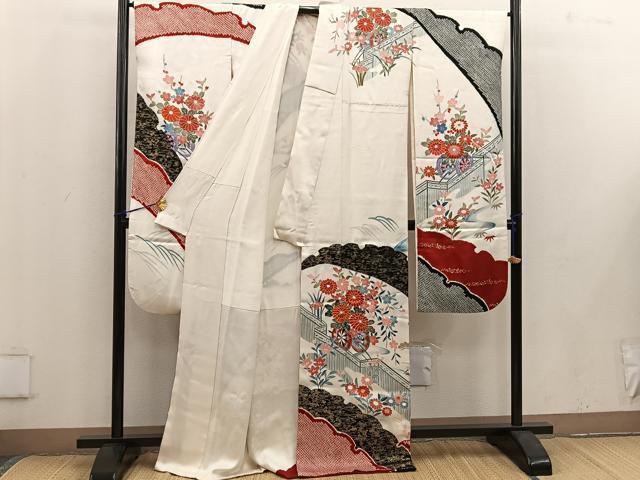 Heiwaya Kimono ■ Gorgeous Furisode Kimono with Koma Embroidery and Floating Carriage Design, Gold-Tone, Pure Silk, Excellent Item BAAV8101mz