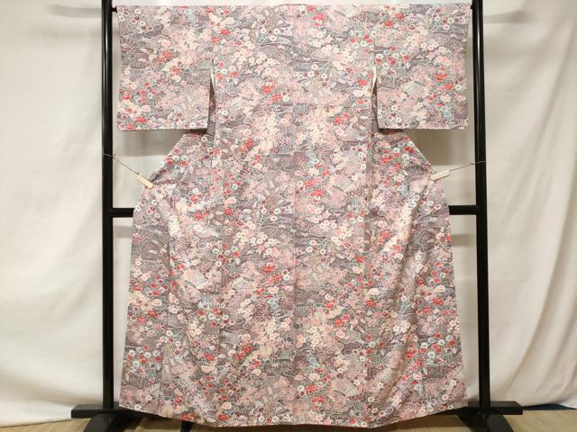 Heiwaya Kimono ■ High-quality Komon (small pattern) with a shibori (dyed) pattern featuring a fan-shaped flowing water and floral design. Pure silk. Excellent quality. CAAZ5582ev