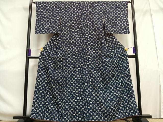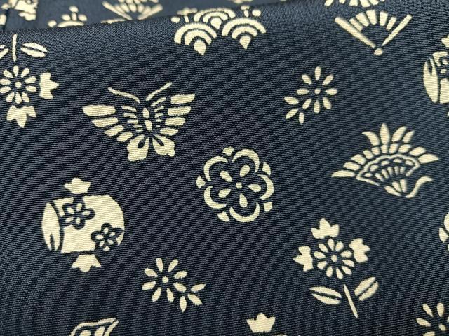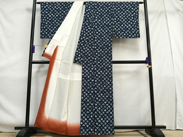 Heiwaya Kimono ■ High-quality small pattern indigo stencil dyed with floral and butterfly motifs. Pure silk. Excellent quality. Unused. AABE7601oa