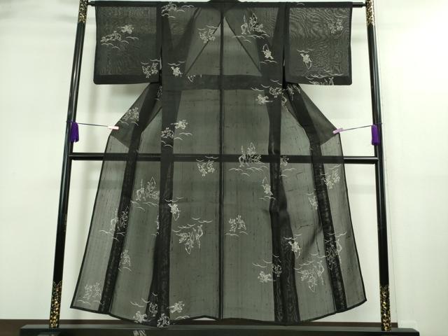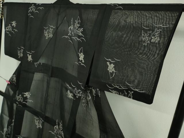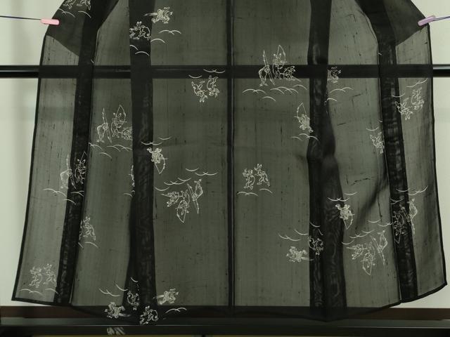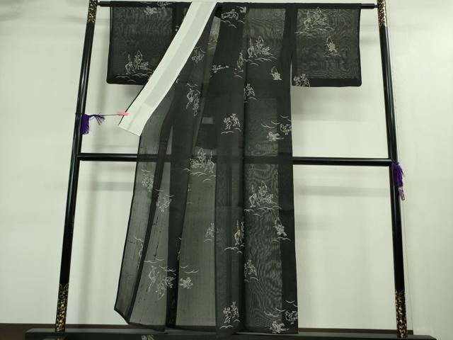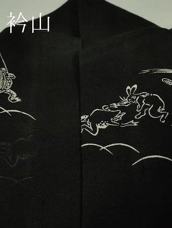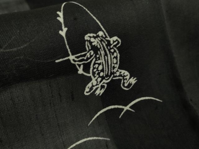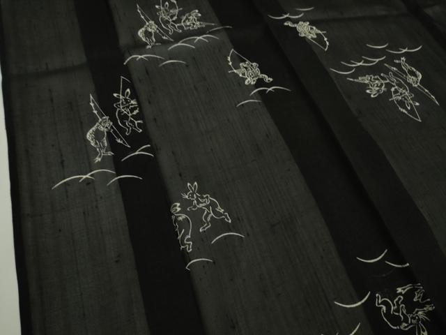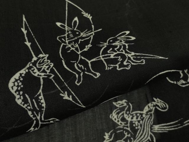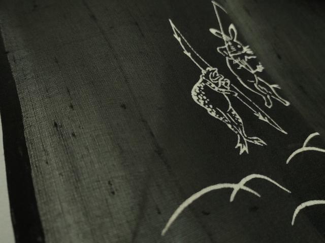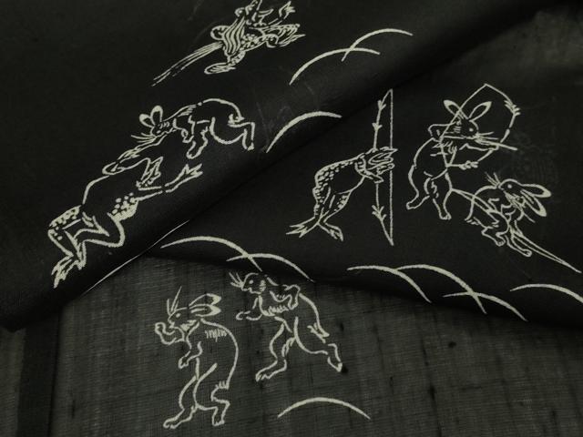Heiwaya Kimono ■ Premium Summer Silk Basho Print, Silk Sasumi, Choju Giga (Caricature of Animals) Design, Black Background, Excellent Condition, DZAA9164kh5