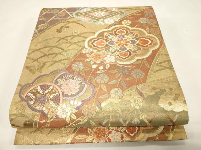 Heiwaya Kimono ◎ Reversible Six-Panel Patterned Obi, Karaori Weave, Keicho Layered Pattern, Well-Framed Floral Design, Gold Thread, Pure Silk, Exquisite Item, CABE3955dy