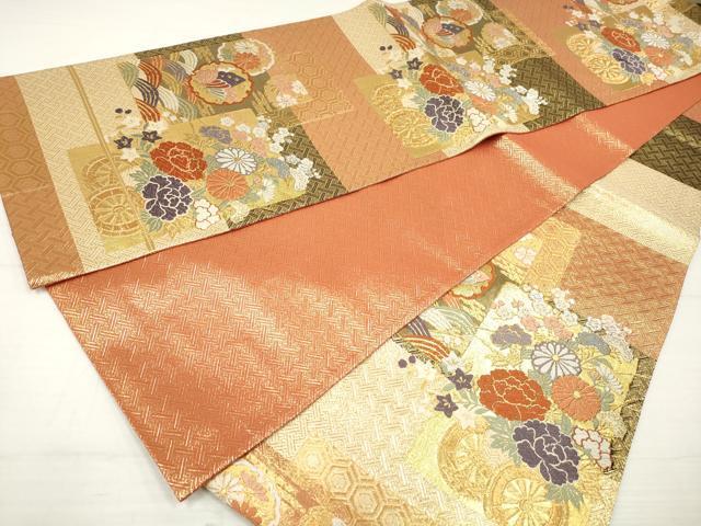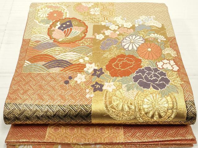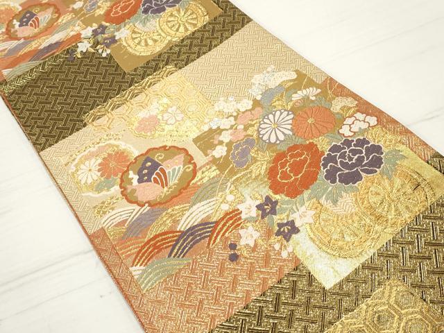 Heiwaya Kimono ◎ Saga Nishiki Six-Piece Pattern Obi (Sash), Karaori Weave, Snow Circle, Flower, and Butterfly Design, Gold Thread, Pure Silk, Excellent Item, DAAZ8598qa